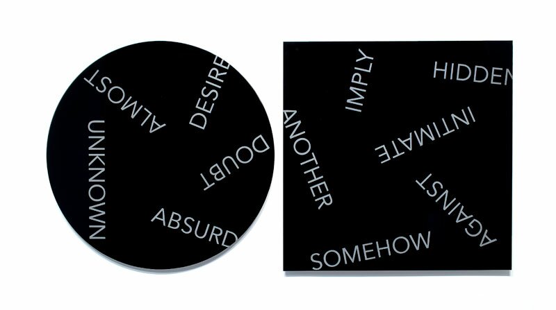 What/Why: “In the latest edition of our ongoing series, One Wall, One Work, Robert Barry has created a new etched mirror diptych – black glass mirror – a 30 inch square juxtaposed with a 30 inch circle, each with text that varies in orientation. Each panel consists of complete words, incomplete words (as they would extend over the edges of the mirror), specific words (e.g. “desire”) and open-ended words (e.g. “almost”). Partly a formal study in comparison (square versus circle, reflective (background) versus opaque (etched text), specific versus general, this work also provides the space among these relationships so as to create a grey space where answers and meanings are not hard, fast or fully defined, but where one can question strict logic and allow for poetic feeling, meaning and opportunity.”