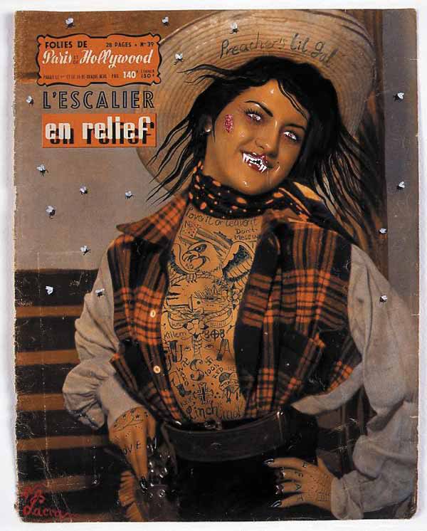 “Jerónimo López Ramírez, also known as Dr. Lakra, is an renowned tattoo artist who lives and works in Oaxaca, Mexico. Under his pseudonym, loosely translating as “Dr. Delinquent,” he draws over vintage printed materials and found objects rather than skin, manipulating images of pin-up girls, 1940s Mexican businessmen, luchadores, and Japanese sumo wrestlers.”