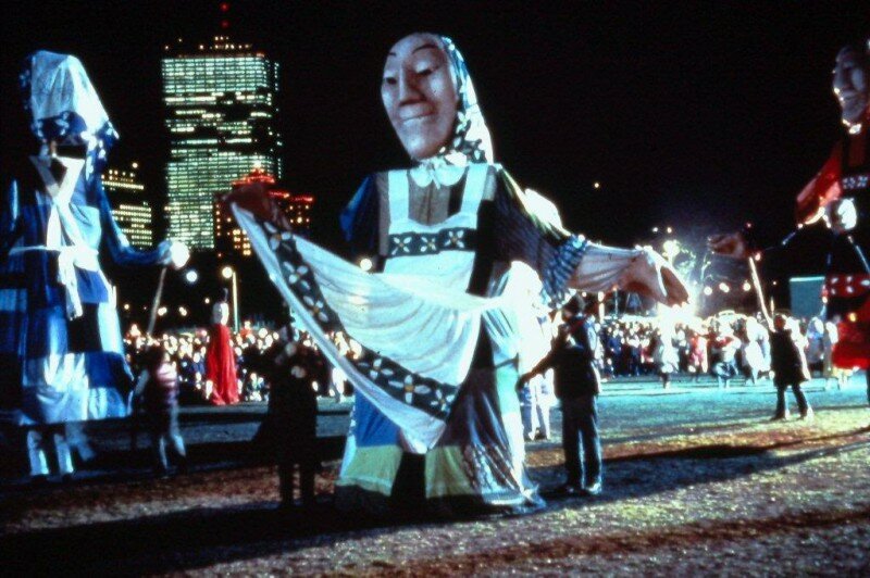 “When First Night was ten years old, John Tagiuri and his wife made this huge cake carriage which was drawn by a pair of Clydesdales down Boylston Street. They were seated next to the cake dressed as a knife and fork and when they arrived at City Hall Plaza, the side of the carriage opened up to reveal an enormous edible version inside that was cut up and handed out to First Night attendees.”-Clara Wainwright