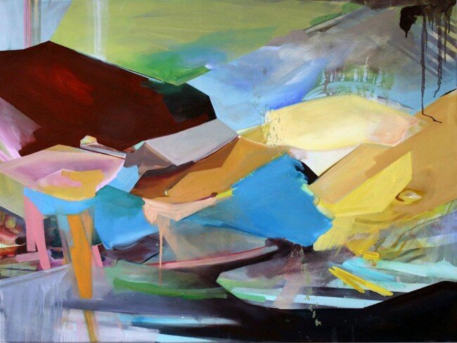 Hues of vibrant greens, orange, and blue are applied in lines of texture ranging in crusty crumbled mass, to juicy slick paint that breathes further life and richness into Benson’s physically encompassing paintings.