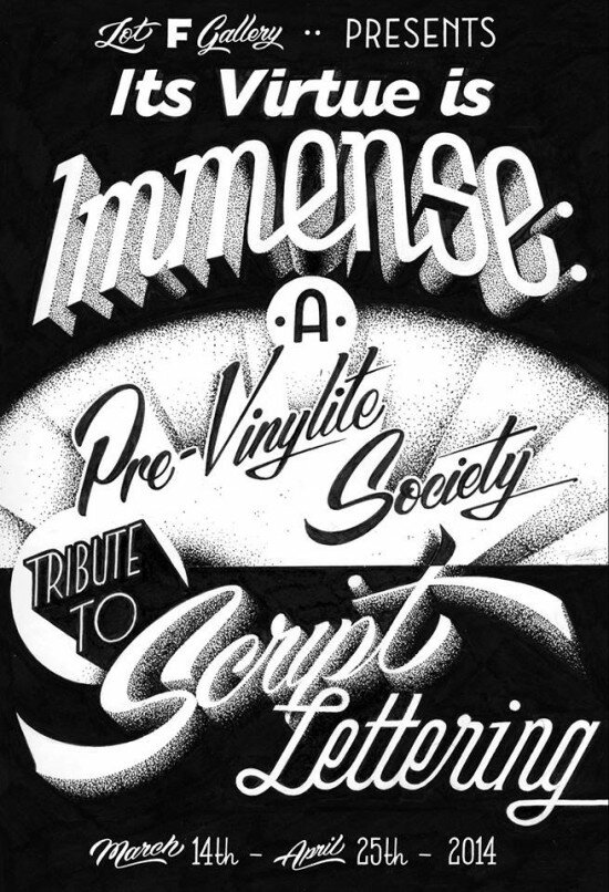 What/Why: “Lot F Gallery is pleased to present, Its Virtue is Immense: a Pre-Vinylite Society Tribute to Script Lettering, this March. Curated by Meredith Kasabian of Boston’s, Best Dressed Signs, the exhibit features script alphabet focused pieces of art by 20 artists from all over. Meredith explains the idea behind the show: