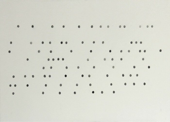 The processes performed on these are simple, and remain simple. Dots, lines, letters and rubbings are made, fabric is folded, the camera is fixed, objects are pressed onto paper, holes are poked. The almost over-simple gestures accrue a vulnerable, striking, beauty; a transcendence.