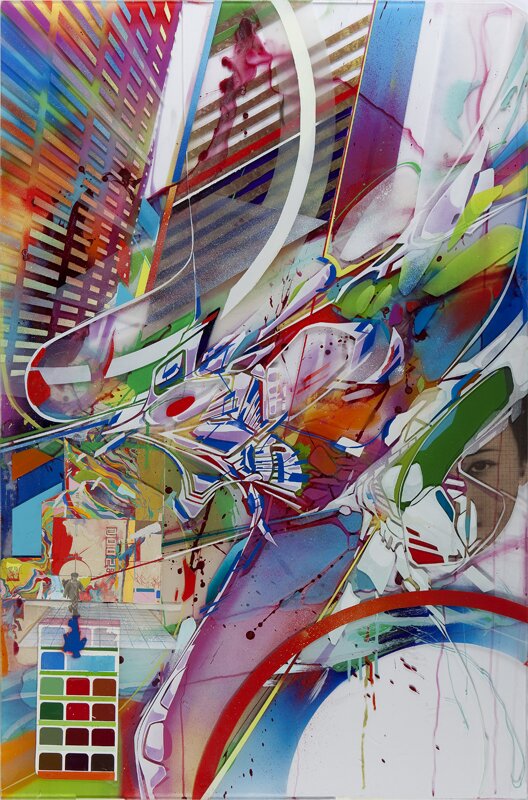 “Graffiti-like forms fracture the canvas and expose the pulse hidden within the landscape. Neon birds bolt across the sky above dripping horizons. Vibrant color spins webs across the canvas while clouds simmer just below the surface. Fine art combines with multimedia and shrouds us in his surreal vision. They remind me of fireworks, the secret lining of the heart, outer space, rare fauna and alien calligraphy. His pieces are gentle yet energetic- executed with an intuitive style that submerges us in a dream. Like an abstract thought carrying blueprints.”