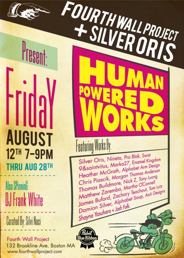 What/Why: “This group show features Interpretations of the human engine. All manner of self powered transit form the content and medium interpreted by a wide survey of young artists from Boston, NY, and Philadelphia with affiliations ranging from vandalism, the MIT media Lab, the Distillery, Artists For Humanity, SCUL(anarcho-bike gang) and Paint Pens in Purses”