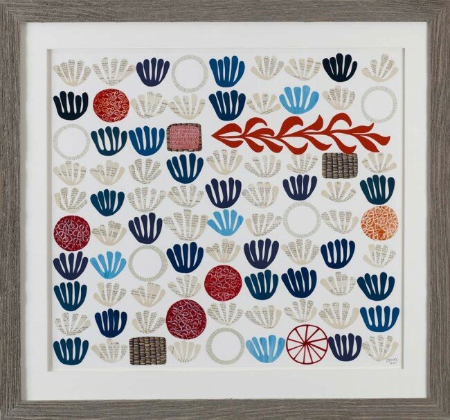 As she explores the coast of Maine, Judd-McGee chronicles her visual experience with a macro lens, simultaneously softening and focusing the gaze and what is captured. With a collection of this resource material, she’s galvanized to create her work of meticulously cut paper, mixed media, and paper and ink. Much of this colorful, gorgeous REVERIE work is repetitive patterns – rows of leaves, pods, flowers, metal findings, beach stones. And while Judd-McGee adapts to her recently diagnosed chronic illness, her art, in turn, adapts and evolves. “Since making my work feels akin to breathing, I find myself seeking a state of reverie as often as possible”, she explains. “