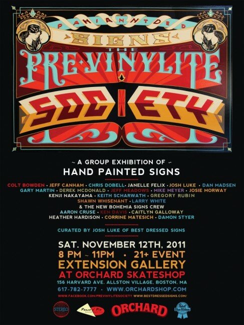 This event is 21+. For those under 21 and anyone else interested in learning more about the craft of hand-painted signs, Josh Luke of Best Dressed Signs will be conducting an informal demo/workshop on the following Saturday afternoon (Nov, 19) at 2pm in the gallery at Orchard Skateshop. Josh will explain the techniques and tools used in making hand-painted signs including basic letter strokes, pattern making, pinstriping, and gold leaf. This demo/workshop is an all ages event.”