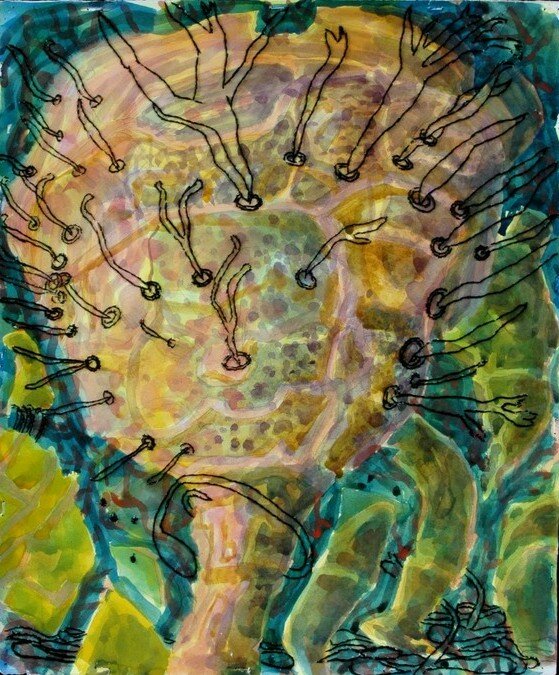 Susan Heideman deconstructs monotypes, ripping and then sewing or glueing the pieces together. She paints on top of these ragged surfaces making in essence, a low-relief topographic map. Her colors are by turns delicate or intense. The sutured images and the organic forms of her “Proteanna Series” are hybrids. The process is provisional – each accrual, obliteration or combination an artistic conversation, evolving by the impulses of the creator. The resulting works pulse with energy – their curling questing forms reach out to us, alchemizing two dimensions into three.