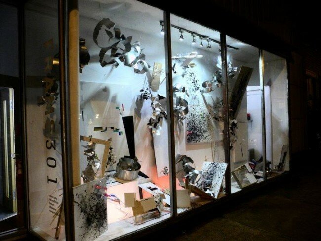 What/Why: “Curated by Lydia Gordon, this Frame 301 installation is a site-specific material arrangement that explores the platforms of human interaction through the use of physical and non-physical materials. The artist uses recycled objects, canvas, paint, aluminum, light, and sound to create a non-linear material narrative within the Frame 301 space. The relationship of the installation’s physical and non-physical materials represents contemporary trends of communication, activities that now encompasses both virtual and in-person interaction.