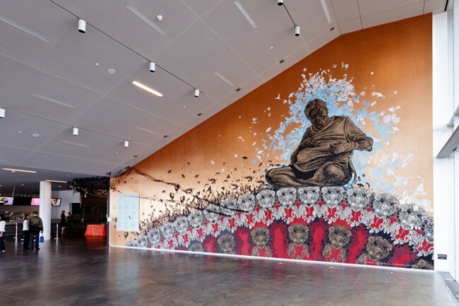 For the ICA’s fifth installation of the Sandra and Gerald Fineberg Art Wall, Swoon’s installation will extend from the elevator atrium to the lobby, soaring 40 feet up to the ceiling—the largest installation to occupy the Fineberg Art Wall. The work, titled Anthropocene Extinction, is composed of streams of intricately cut paper which connect key sculptural elements within the installation, including a 400-pound, suspended bamboo sculpture. The exhibition is accompanied by an ICA-produced video featuring installation footage and an interview with the artist.”